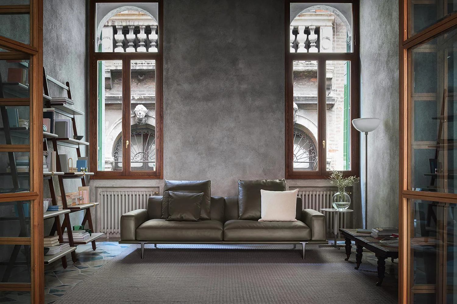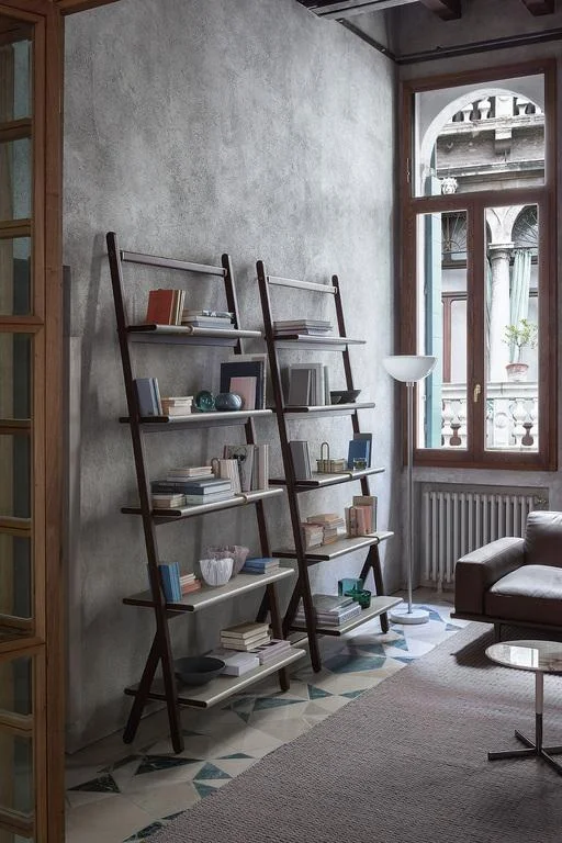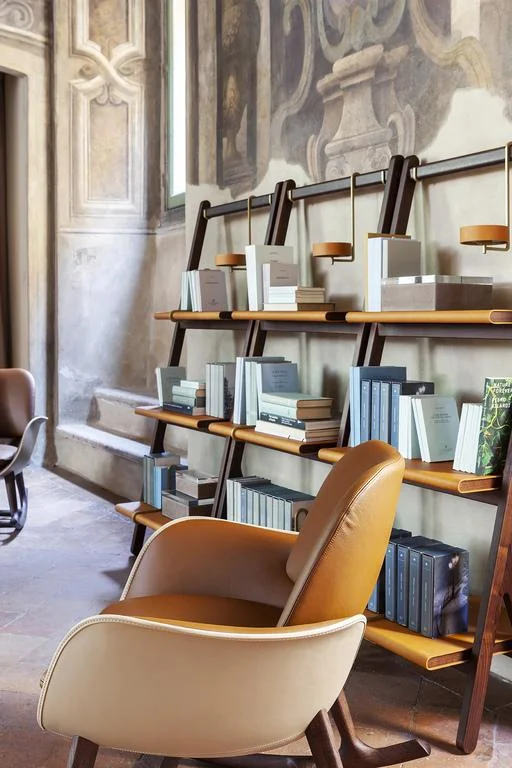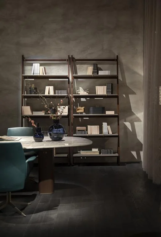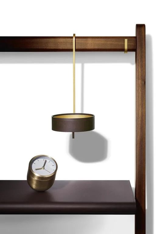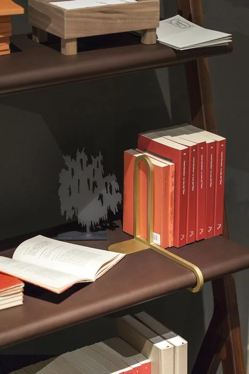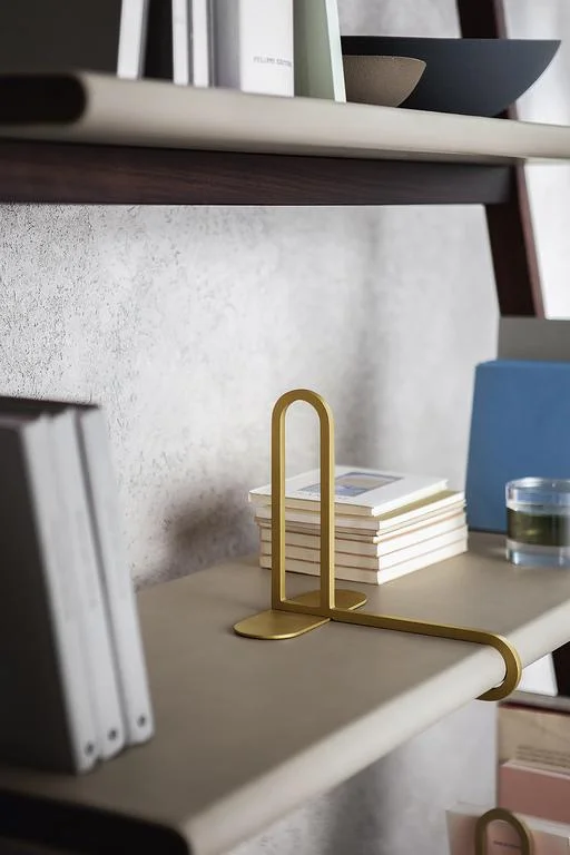Книжкова шафа Ren є графічним переплетенням ліній. Два бічні стояки, злегка нахилені, підтримують полиці з березової фанери, оббиті шкірою для сідел із шпоном горіха Canaletto з боків. Верхня поперечина кріпиться до стіни за допомогою металевих гачків із натуральним латунним оздобленням. Книжкова шафа доступна в низькій версії з круглим універсальним підносом, оббитим шкірою для сідел, що висить із верхньої поперечини, та у високій версії. Вони відрізняються за висотою, шириною та кількістю полиць. Обидва варіанти можуть бути доповнені книжковими упорами з матової сталі з натуральним латунним оздобленням.