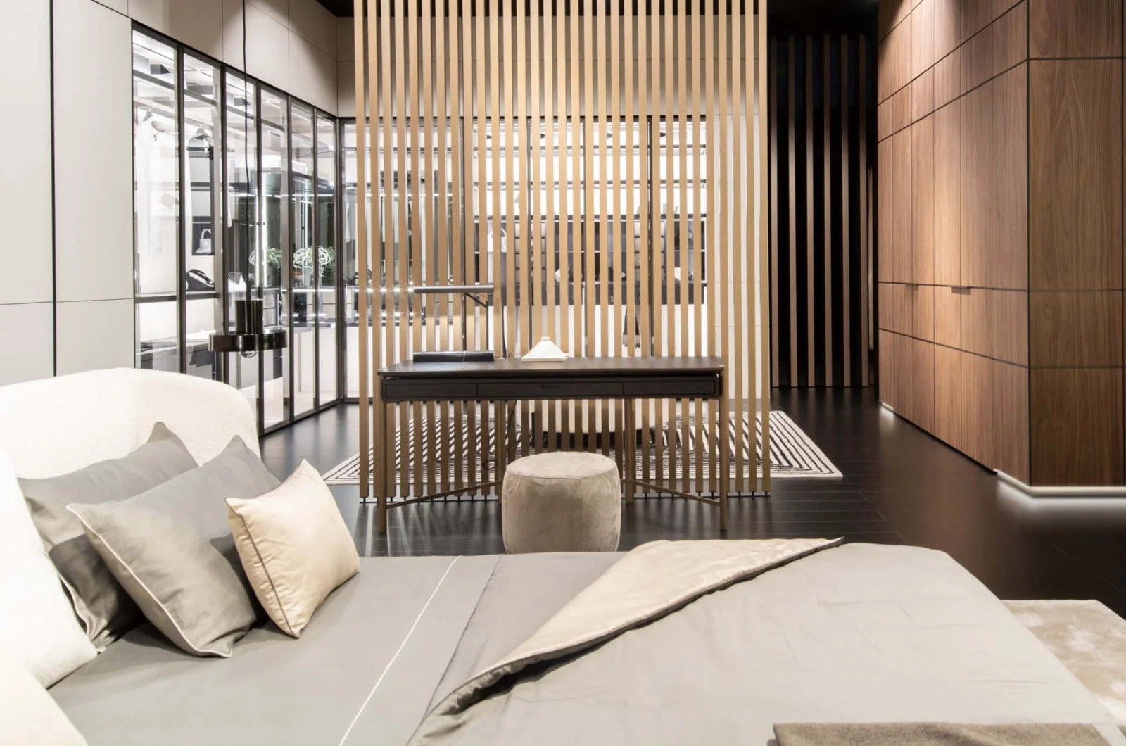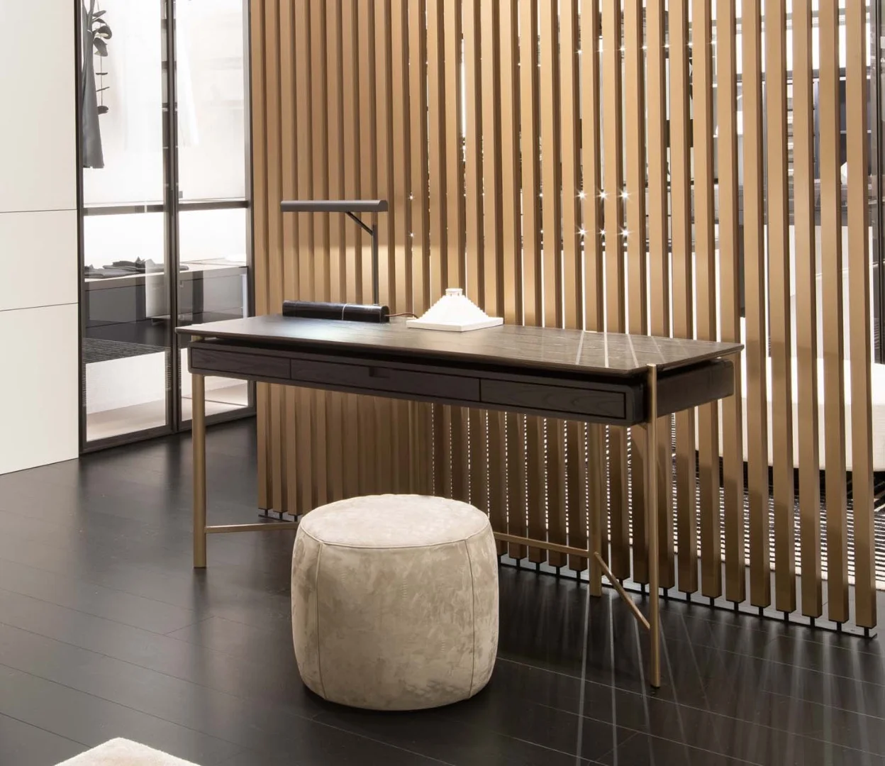 Письмовий стіл Eros виділяється своїм легким і вишуканим дизайном та якістю матеріалів. Мінімальна конструкція з бронзового або гарматно-сірого металу робить контейнер і стільницю, прикрашену шпоном чорного дуба, майже підвішеними. Візуальна гра, створена діалогом між різними матеріалами, привносить елемент безпомилкового смаку та майстерності у житлову зону.